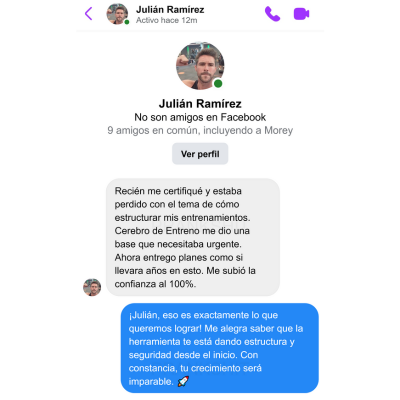 Cerebro de Entreno es un asistente digital inteligente que crea planes de entrenamiento totalmente personalizados en minutos. No necesitas descargar nada: funciona desde tu navegador y te guía paso a paso con preguntas simples sobre el perfil del usuario.